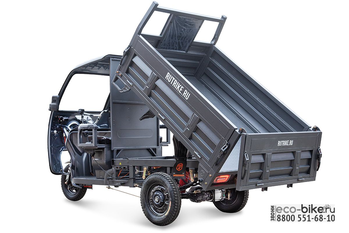 Электрический трицикл Rutrike D5 Кабина гидравлика оснащён крепким и вместительным кузовом с высокими бортами и гидравлическим подъёмным механизмом, позволяющим быстро осуществлять погрузку-разгрузку. Мощный гидравлический подъёмный привод позволяет поднимать кузов с загрузкой до 400 кг. А общая грузоподъёмность трицикла составляет до 900 кг.